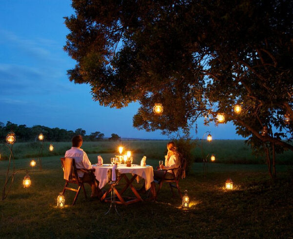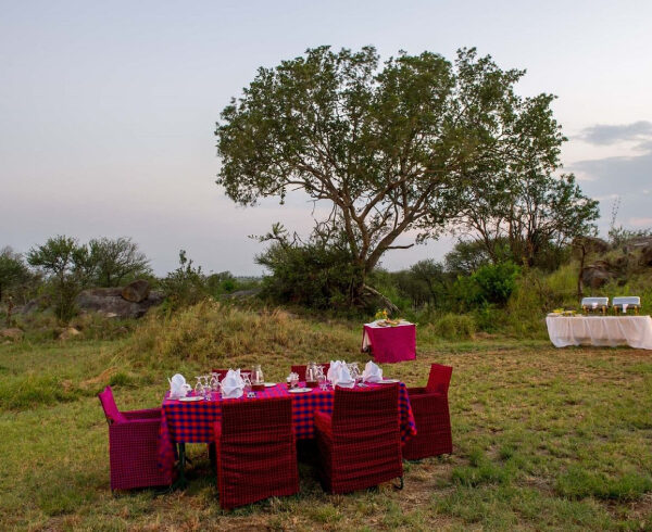 A bush dinner right on the plains of Serengeti National Park is the ultimate romantic dining experience! During a bush dinner, a delicious meal is served on the savannah plains under a sky glittering with stars. Enjoy the crackling of a campfire while listening to the animals scurrying in the dark around you. Usually, tables are set up just outside the camp, but still close enough to be safe.